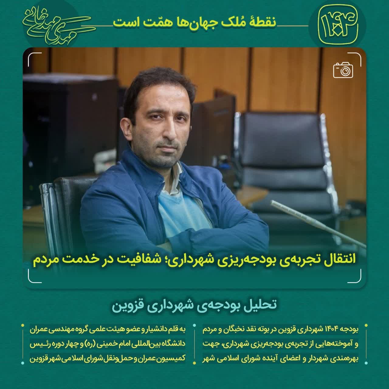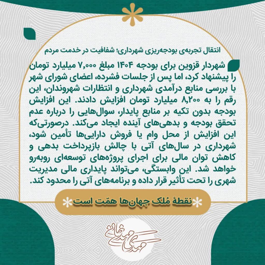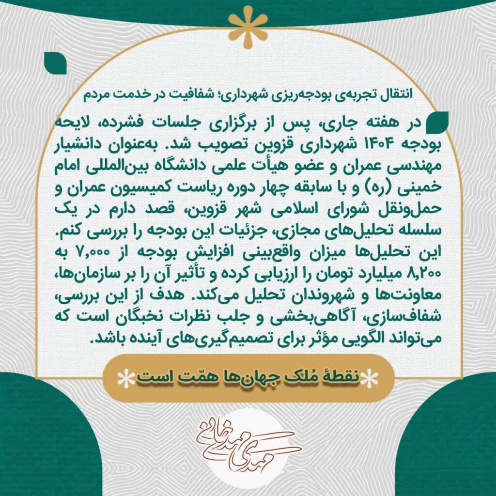 سعی می شود در قالب متون کوتاهی، بودجه ۱۴۰۴ شهرداری قزوین بررسی شود. از برنامههای توسعه تا نتایج بودجه، تحلیل شده و پیامدهای آن به مردم اطلاعرسانی شود.