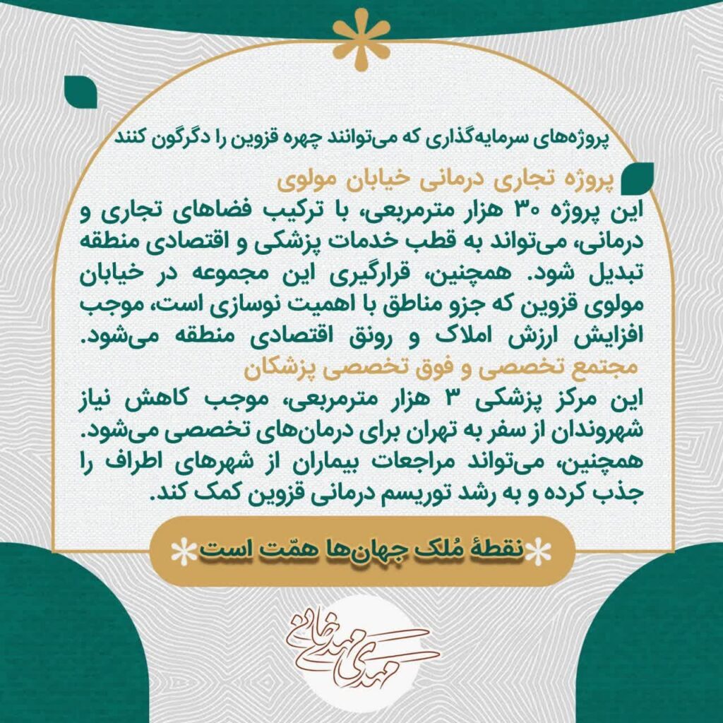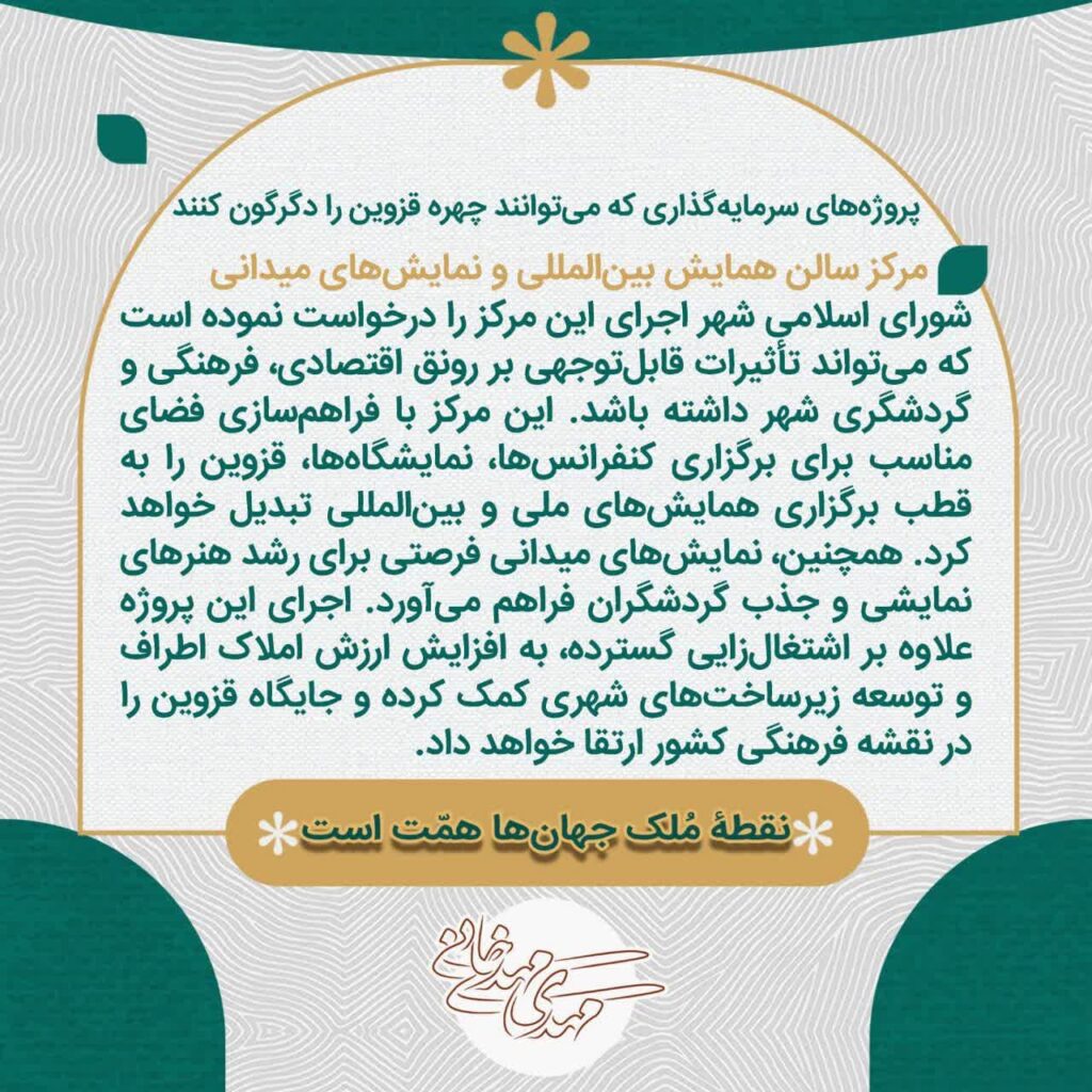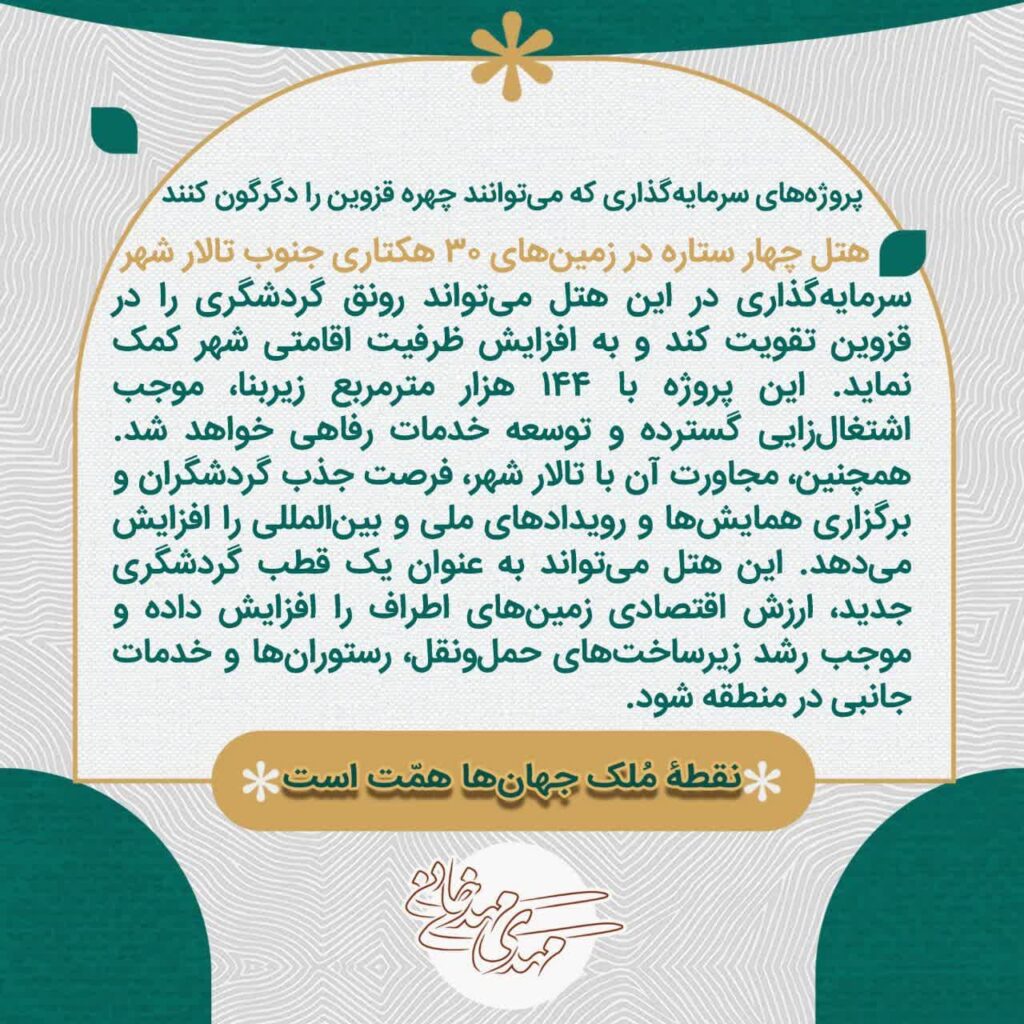 سرمایهگذاری در پروژههای گردشگری، تجاری، رفاهی و زیرساختی قزوین موجب رونق اقتصادی، افزایش اشتغال، بهبود حملونقل، ارتقای خدمات شهری و تقویت جایگاه فرهنگی و گردشگری شهر خواهد شد.