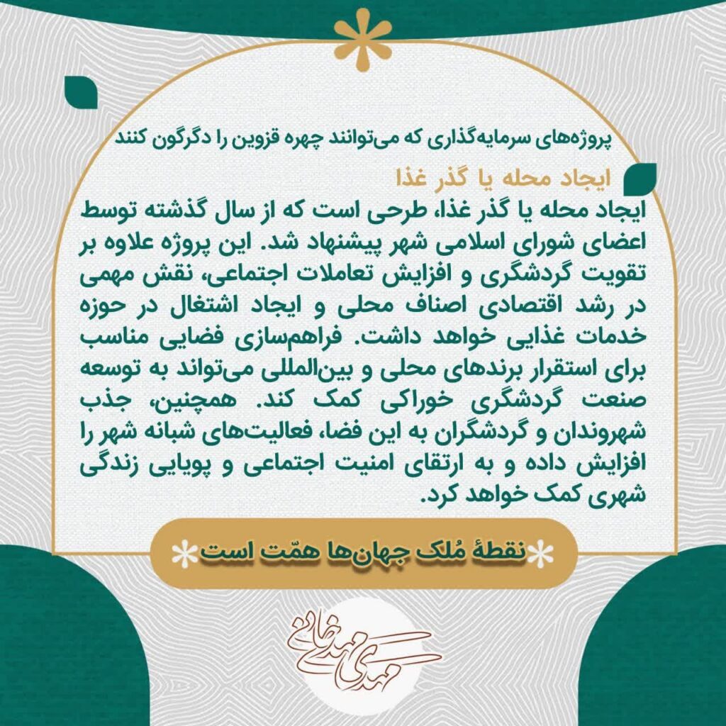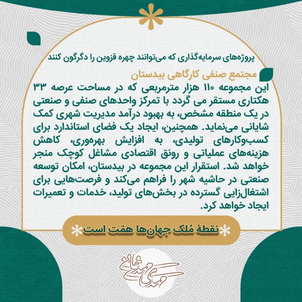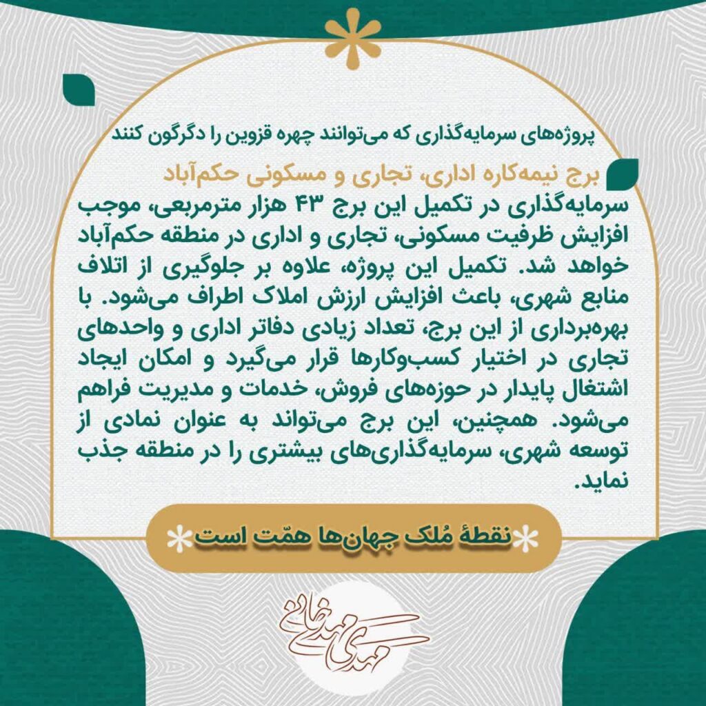 سرمایهگذاری در پروژههای گردشگری، تجاری، رفاهی و زیرساختی قزوین موجب رونق اقتصادی، افزایش اشتغال، بهبود حملونقل، ارتقای خدمات شهری و تقویت جایگاه فرهنگی و گردشگری شهر خواهد شد.